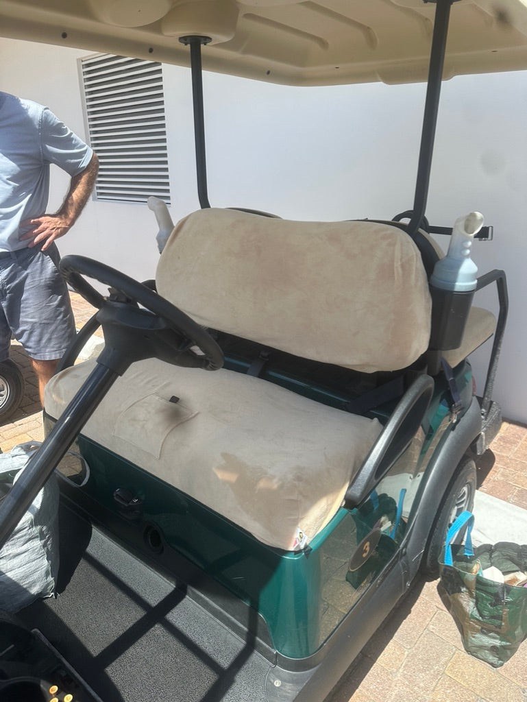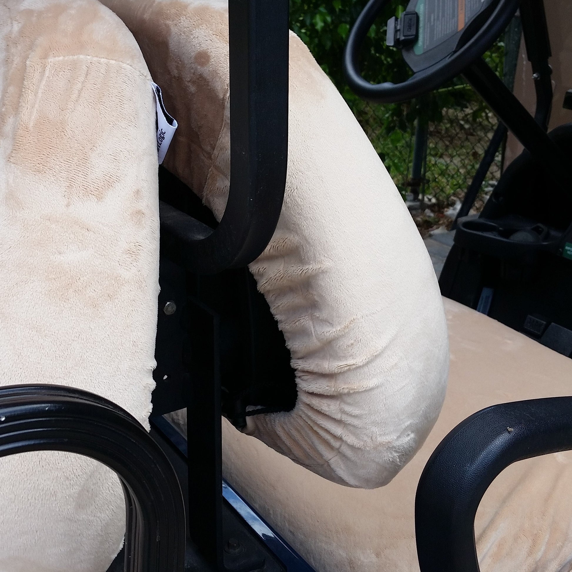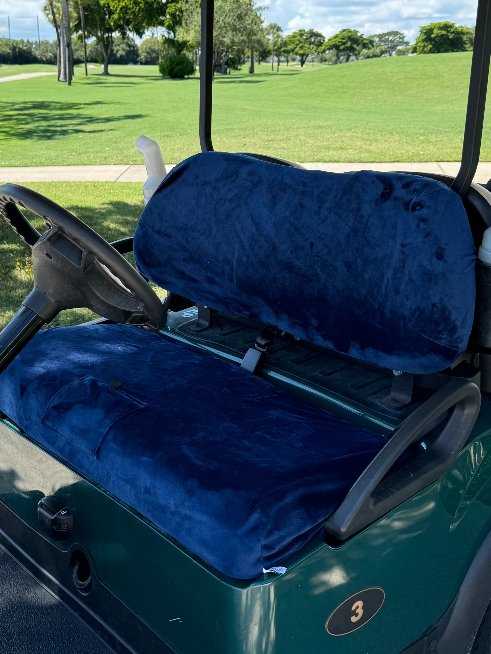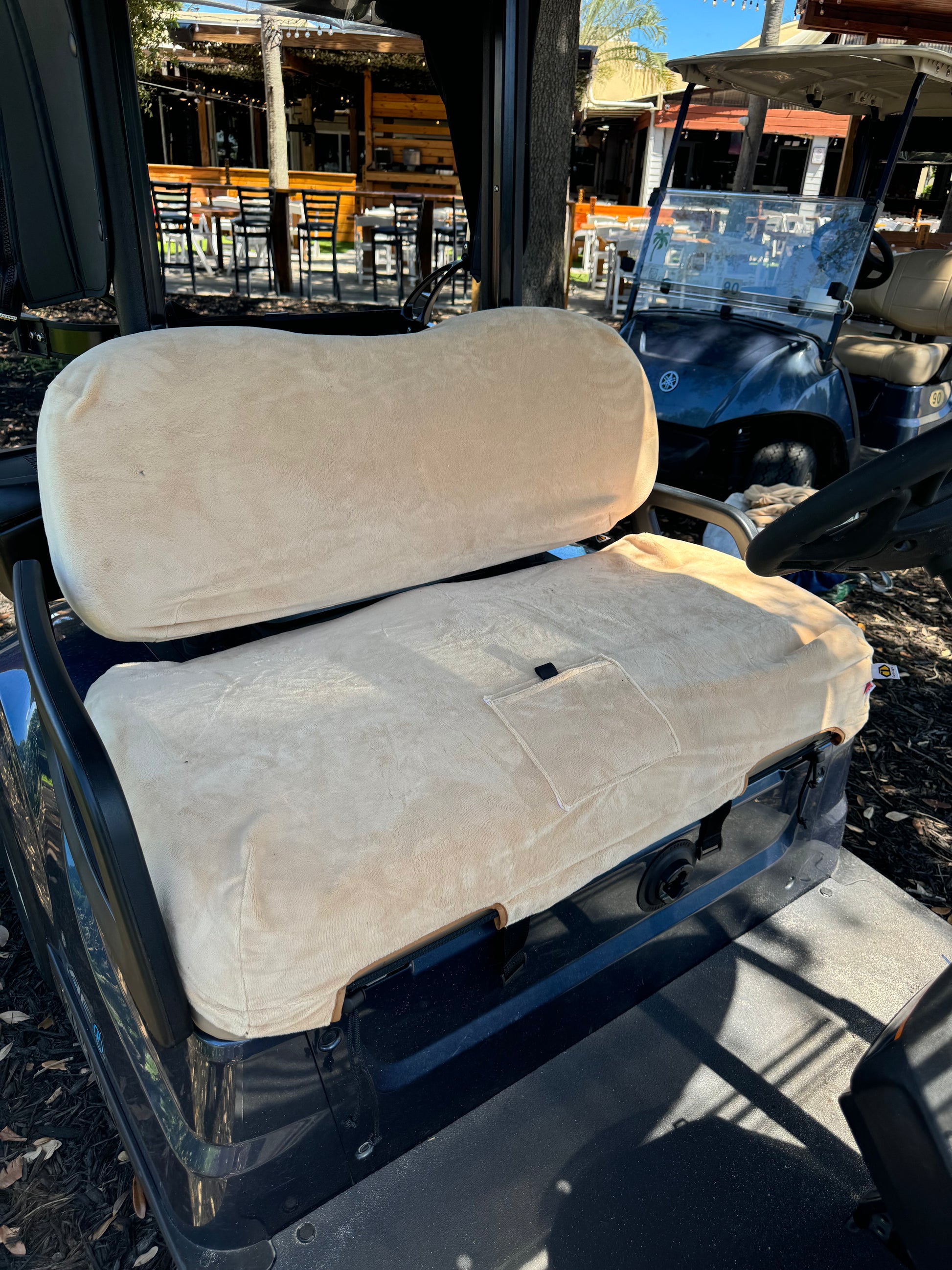 Our new Lux Plush High Back fitted seat cover sets are made from the highest quality lux plush fabric and designed to fit securely onto the back cushion and seat cushion of the golf cart. They are designed to slip on easily and stay put with marine grade elastic cording that is then tightened and cord locked to ensure a snug fit. With the addition of the Velcro straps the covers will maintain their fit. They are easy to take on and off and our covers are machine washable and machine dryable on low heat. The bottom seat covers has a handy center pocket with Velcro closure to keep personal items like cell phones and wallets secure. The pocket color will be the same the color as the chosen fabric (not the colors pictured in the photos) The High Back set of covers fit most Club Car Precedent, Yamaha and EZ-Go golf cart seat styles. Our seat covers are proudly made in the USA! Custom Fabric colors available for a min order of 12 sets. Please call us for Pricing on custom orders. ONE SET includes 1 back cushion and 1 bottom cushion.